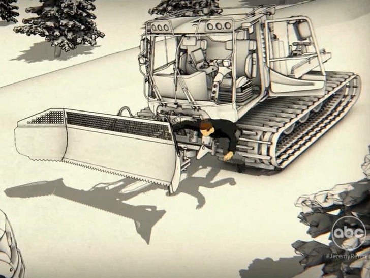 Try the animation of how the accident occurred … an animation featured in his ABC sit-down with Diane Sawyer, which aired Thursday evening. As Jeremy describes it, he was within the cab of the snowplow however needed to see the place his nephew was. He stepped onto the observe of the snowplow to look, however the observe was shifting and he fell to the bottom. He then noticed his nephew was in hurt’s approach and tried to get again on the plow by leaping on the observe, and that is when he was run over.
